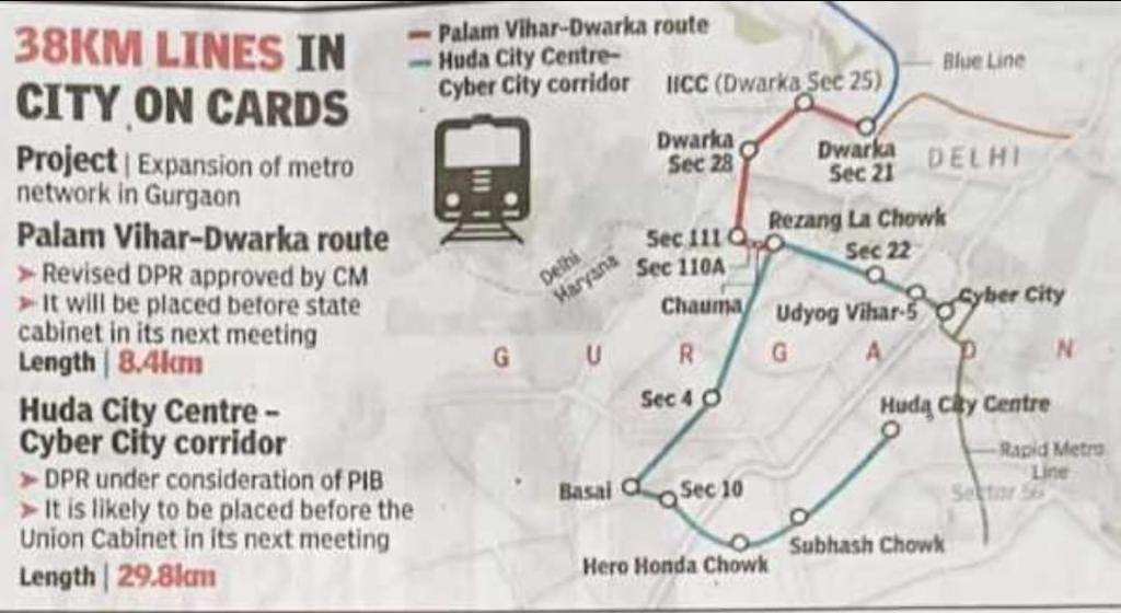 TOI had reported earlier this that GMRL was considering building an interchange station, possibly at Cyber City, to connect the new corridor with the Rapid Metro line.