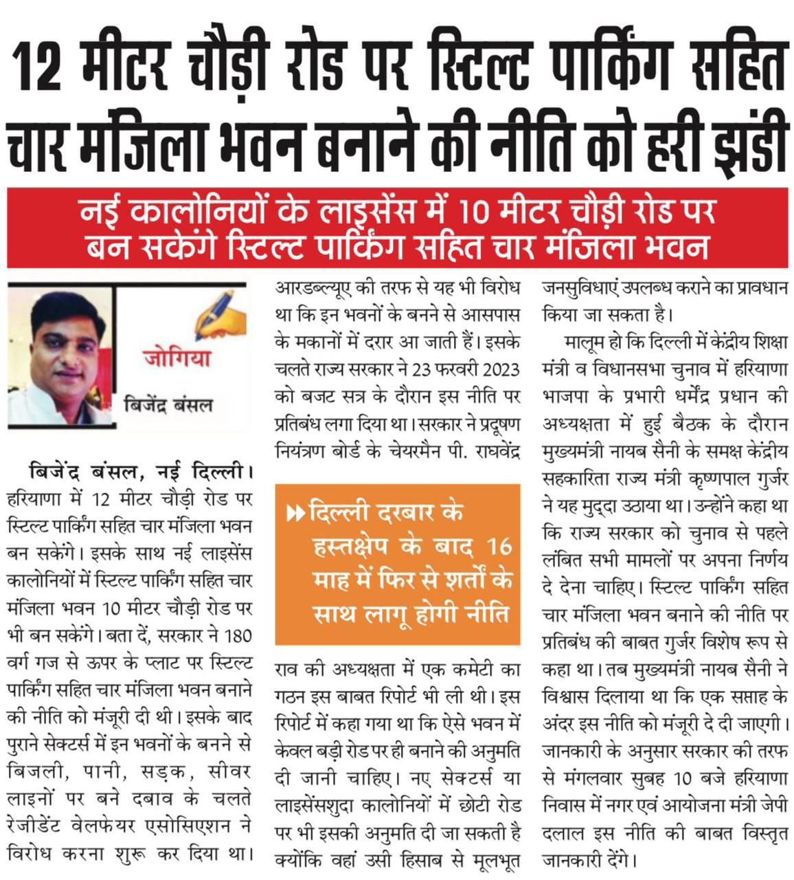 बता दें कि हरियाणा सरकार ने 23 फरवरी से स्टिल्ट पार्किंग के साथ चार फ्लोर के निर्माण के नक्शे पास करने पर रोक लगा दी है। 16 मार्च को टाउन एंड कंट्री प्लानिंग के महानिदेशक टीएल सत्यप्रकाश की तरफ से सरकार ने मामले में एक्सपर्ट कमेटी गठित कर दी है, जो आठ सप्ताह में अपनी रिपोर्ट सौपेंगी। इसके बाद ही स्टिल्ट पार्किंग के साथ चार फ्लोर के निर्माण की नियमावली के भविष्य का फैसला होगा।
