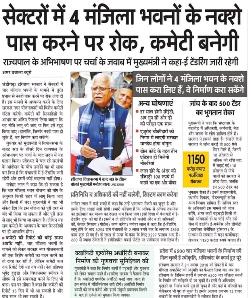 मनोहर लाल ने कहा कि हो सकता है कि चार मंजिला भवन योजना को मांग के अनुसार किसी शहर में लागू किया जाए और किसो में बंद। मुख्यमंत्री ने यह भी संकेत दिए कि इस योजना को पूरी तरह से बंद भी किया जा सकता है और पूरी तरह किया जा सकता है। लेकिन यह अध्ययन के बाद सिफारिशों पर हो आधारित होगा।
