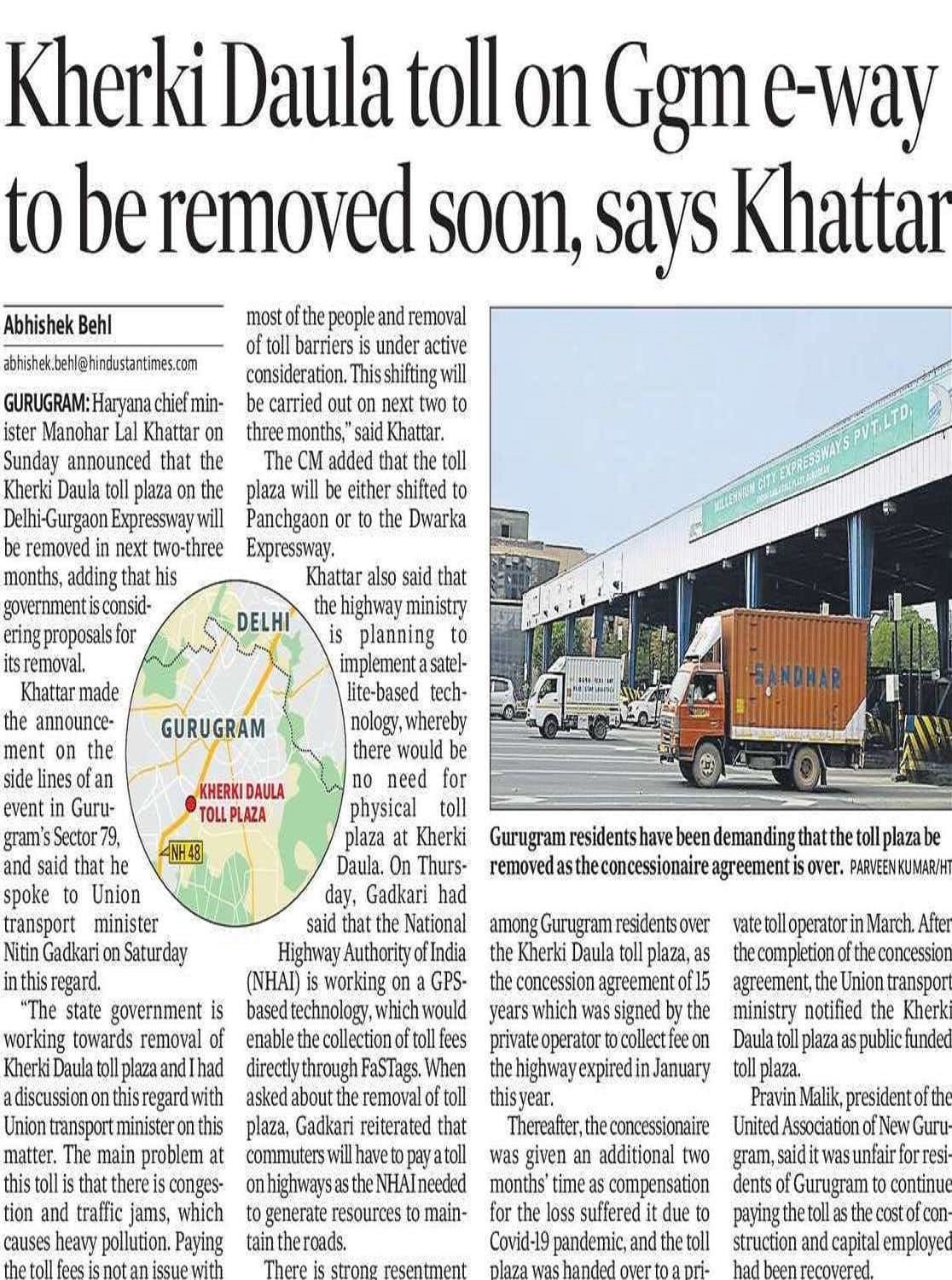 “The state government is working towards removal of Kherki Daula toll plaza and I had a discussion on this regard with Union transport minister on this matter. The main problem at this toll is that there is congestion and traffic jams, which causes heavy pollution. Paying the toll fees is not an issue with most of the people and removal of toll barriers is under active consideration. This shifting will be carried out on next two to three months,” said Khattar.