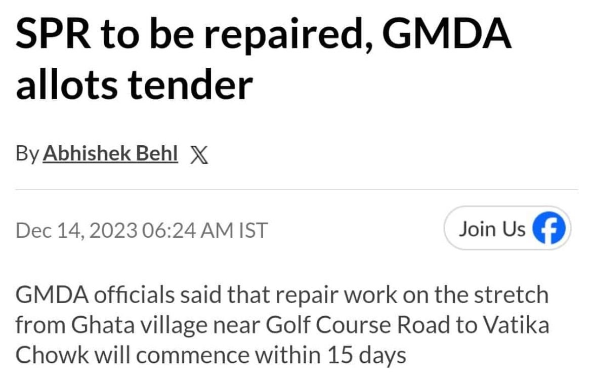 GMDA officials said that repair work on the stretch from Ghata village near the Golf Course Road to Vatika Chowk will commence within the next 15 days. The authority will ensure that once the work is completed, there would be no potholes or damaged patches on the road, they added.