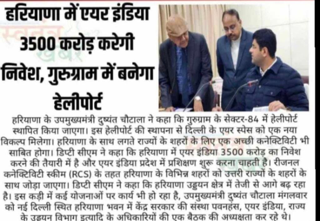 हरियाणा के उपमुख्यमंत्री दुष्यंत चौटाला ने कहा कि गुरुग्राम के सेक्टर-84 में हेलीपोर्ट स्थापित किया जाएगा। इस हेलीपोर्ट की स्थापना से दिल्ली के एयर स्पेस को एक नया विकल्प मिलेगा। हरियाणा के साथ लगते राज्यों के शहरों के लिए एक अच्छी कनेक्टिविटी भी साबित होगा। डिप्टी सीएम ने कहा कि हरियाणा में एयर इंडिया 3500 करोड़ का निवेश करने की तैयारी में है और एयर इंडिया प्रदेश में प्रशिक्षण शुरू करना चाहती है। रीजनल कनेक्टिविटी स्कीम (285) के तहत हरियाणा के विभिन्न शहरों को उत्तरी राज्यों के शहरों के साथ जोड़ा जाएगा। डिप्टी सीएम ने कहा कि हरियाणा उड्डयन क्षेत्र में तेजी से आगे बढ़ रहा है। इस कड़ी में कई योजनाओं पर कार्य भी हो रहा है, उपमुख्यमंत्री दुष्यंत चौटाला मंगलवार को नई दिल्ली स्थित हरियाणा भवन में केंद्र सरकार की संस्था पवनहंस, एयर इंडिया, राज्य के उडयन विभाग इत्यादि के अधिकारियों की एक बैठक की अध्यक्षता कर रहे थे।