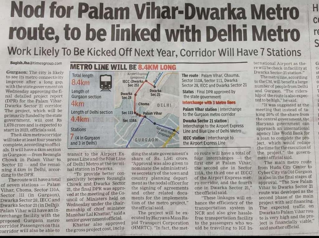 Gurgaon: The City is likely to see its metro connectivity improve after a long gap, with the state government on wednesday approving the final detailed project report (DPR) for the Palam Vihar Dwarka Sector 21 corridor. The project, which will be primarily funded by the state government, will cost Rs 1,678 crore and is expected to start in 2023, officials said.