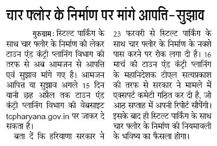 गुरुग्राम : स्टिल्ट पार्किंग के साथ चार फ्लोर के निर्माण को लेकर टाउन एंड कंट्री प्लानिंग विभाग की तरफ से अब आमजन से आपत्ति एवं सुझाव मांगे गए है। आमजन आपित्त या सुझाव अगले 15 दिन यानी छह अप्रैल तक टाउन एंड कंट्री प्लानिंग विभाग की वेबसाइट tcpharyana.gov.in पर जाकर दे सकता है।