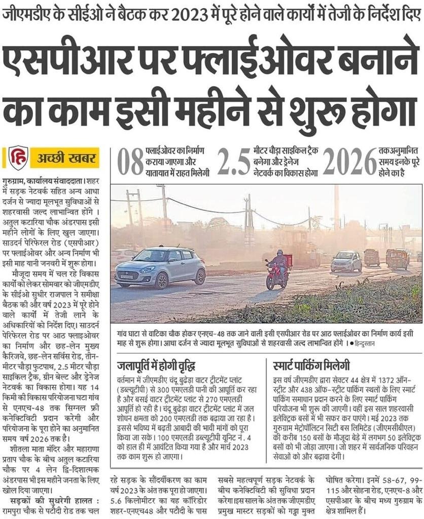 गुरुग्राम, कार्यालयसंवाददाता। शहर में सड़क नेटवर्क सहित अन्य आधा दर्जन से ज्यादा मूलभूत सुविधाओं से शहरवासी जल्द लाभान्वित होंगे। अतुल कटारिया चौक अंडरपास इसी महीने लोगों के लिए खुल जाएगा। साउदर्न पेरिफिरल रोड (एसपीआर ) पर फ्लाईओवर और अन्य निर्माण भी इसी माह यानी जनवरी में शुरू होगा।