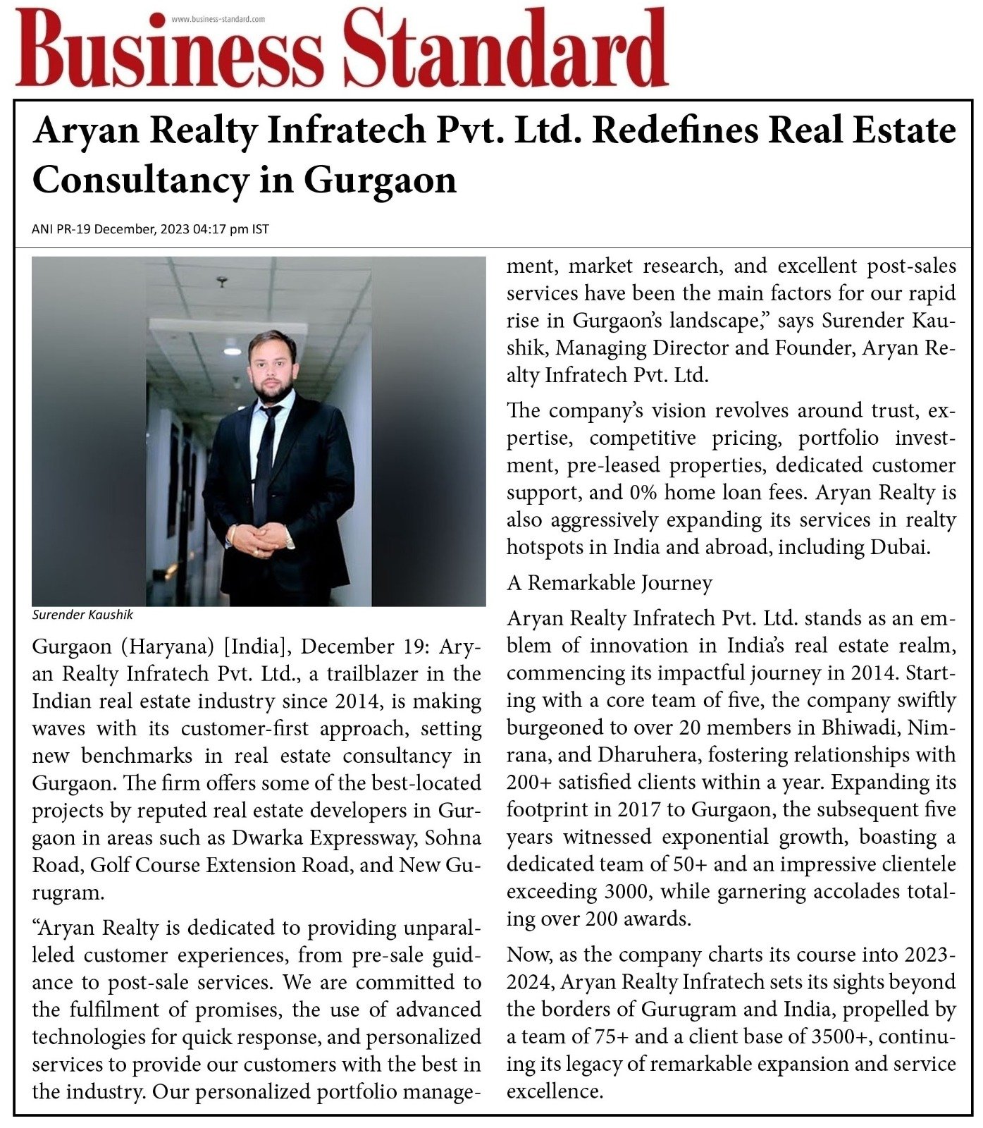Gurgaon (Haryana) [India], December 19: Aryan Realty Infratech Pvt. Ltd., a trailblazer in the Indian real estate industry since 2014, is making waves with its customer-first approach, setting new benchmarks in real estate consultancy in Gurgaon. The firm offers some of the best-located projects by reputed real estate developers in Gurgaon in areas such as Dwarka Expressway, Sohna Road, Golf Course Extension Road, and New Gurugram.