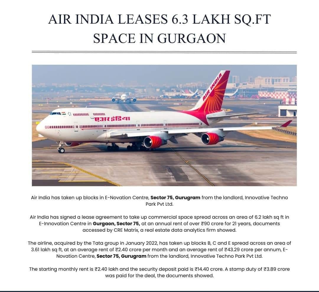 Air India has signed a lease agreement to take up commercial space spread across an area of 6.2 lakh sq ft in E-Innovation Centre in Gurgaon, Sector 75, at an annual rent of over 90 crore for 21 years, documents accessed by CRE Matrix, a real estate data analytics firm showed.