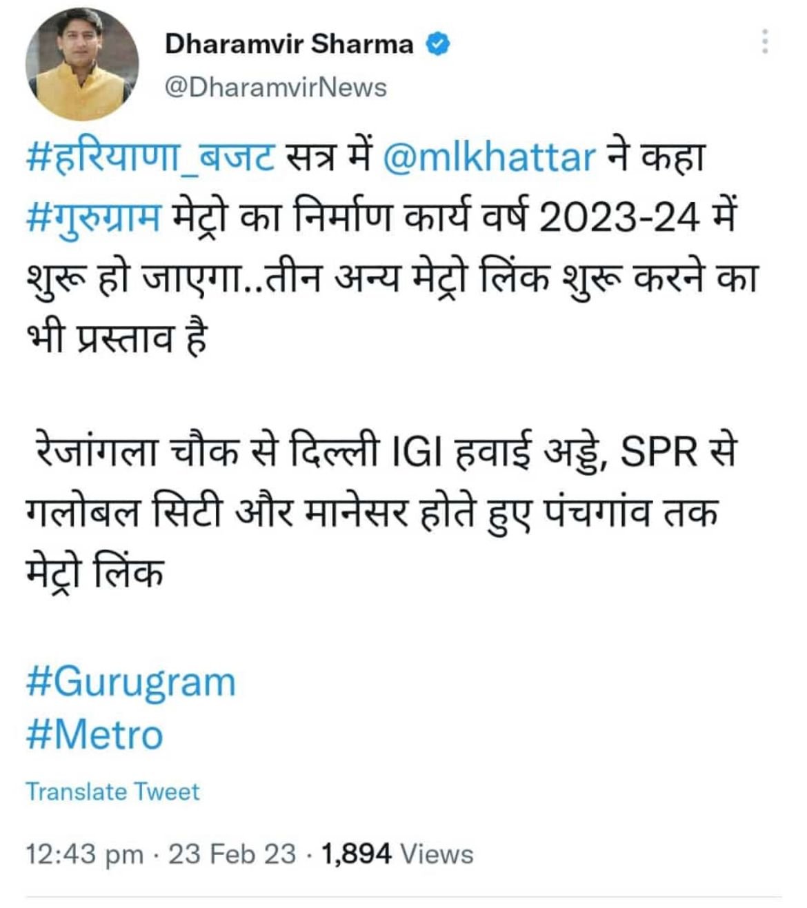 हरियाणा बजट सत्र में ML.Khattar ने कहा गुरुग्राम मेट्रो का निर्माण कार्य वर्ष 2023-24 में शुरू हो जाएगा.